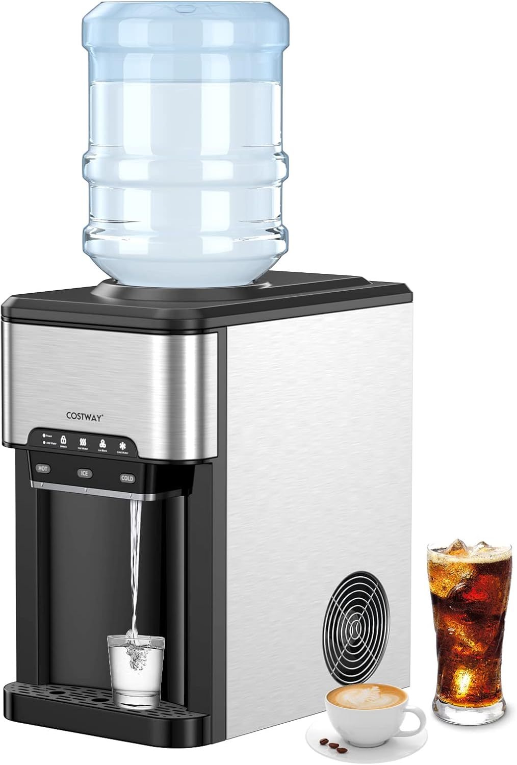 COSTWAY 3 en 1 Machine à Glaçons avec Fontaine à Eau Bonbonne Froide/Chaude, en Acier Inoxydable, 19 kg en 24h, Capacité de 1,5 L, Préparation Rapide en 6-13 Min, Ice Maker Facile à Nettoyer, Noir