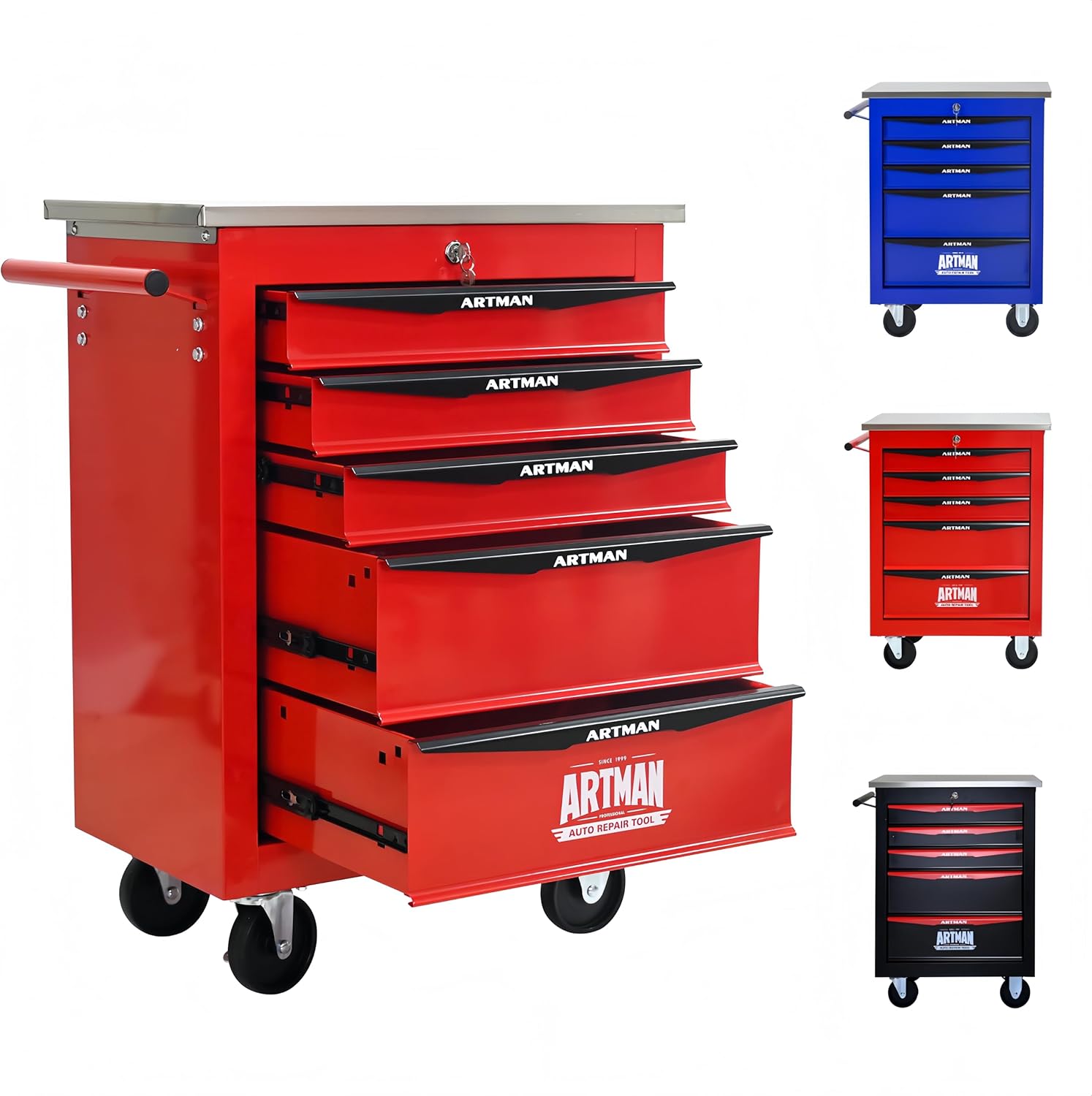 ELIHGTBY Servante d'Atelier Vide à 5 Tiroirs, Chariot d'Outils Robuste sur roulettes - Établi Mobile avec Verrouillage Centralisé, Armoire de Rangement pour Garage, Servante Atelier Rouge et Noir