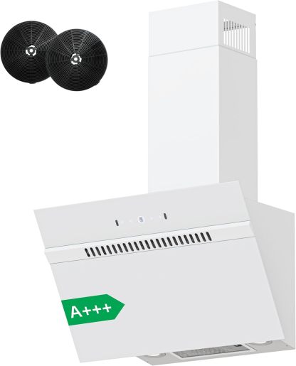 FIREGAS Hotte aspirante inclinée 60 cm, classe A+++, débit d'air 684 m3/h, hotte de cuisine 9 vitesses, commande tactile et gestuelle, hotte murale évacuation ou recyclage, blanc