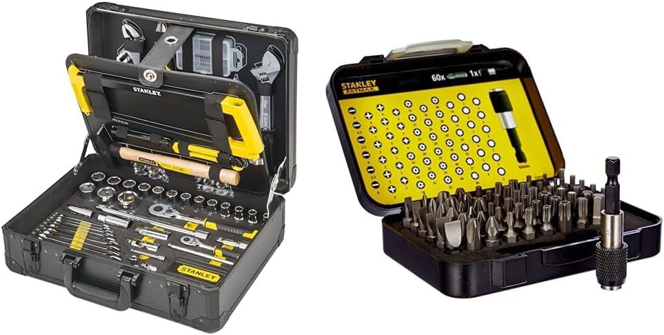 STANLEY Valise de Maintenance - 142 Pièces - Pinces et coupe-touts, clé à molette, niveau et Coffret de 61 Embouts 1/4" 25mm + mallette - Porte Douille Adaptateur 50mm - Porte embout magnétique 60mm